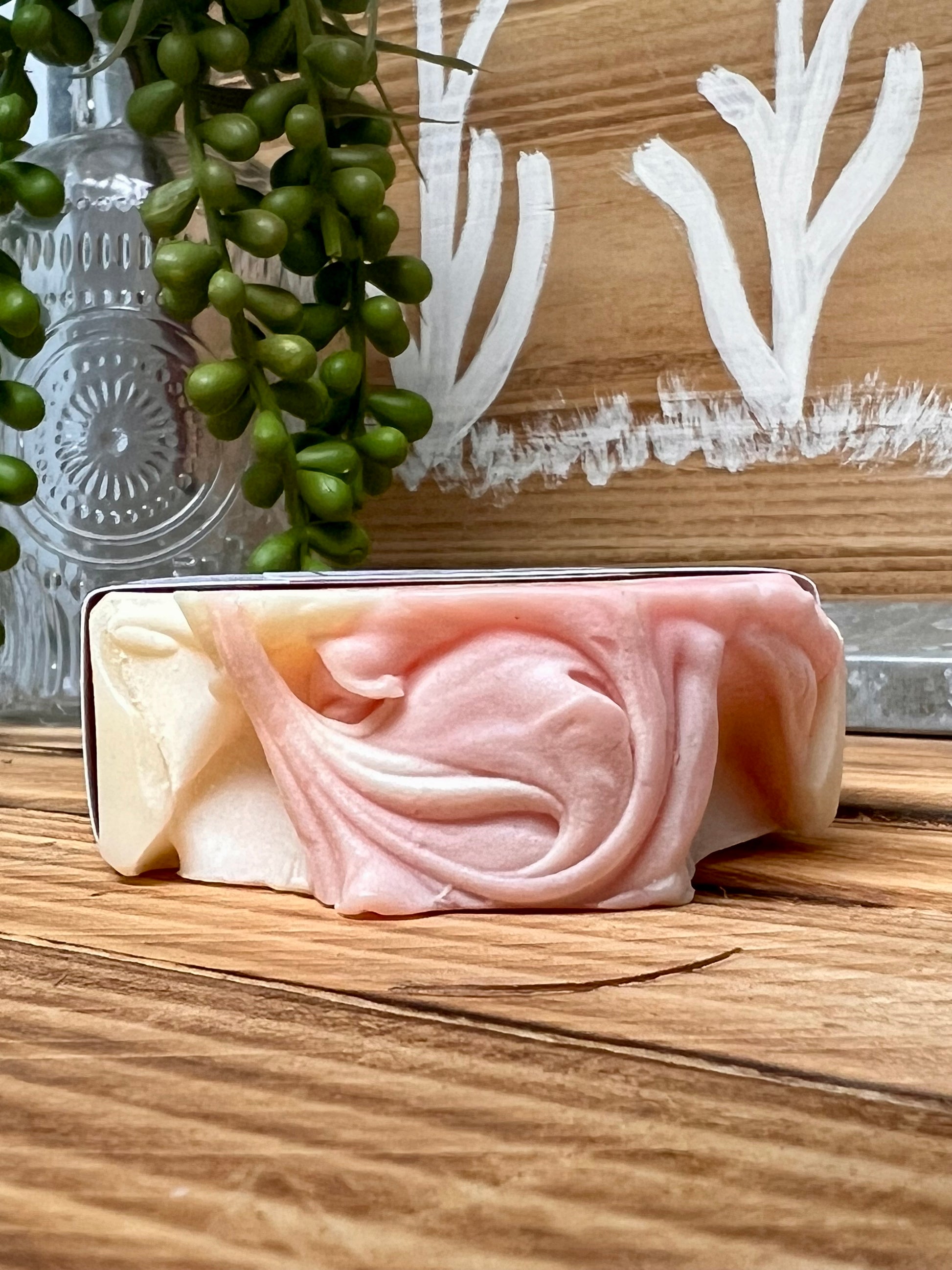 Made with: Coconut milk, coconut oil, olive oil, cocoa butter, shea butter, castor oil, kaolin clay, tussah silk fibers, sodium lactate, organic cane sugar, fragrance oil
